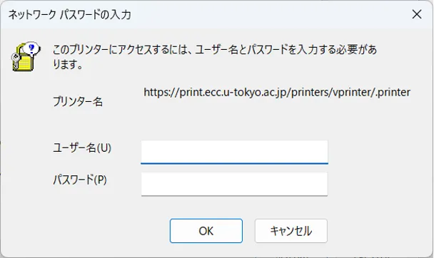 AD\+ユーザ名」を,パスワード欄にはそのパスワードを入力し,「OK」ボタンを押下してください.(ECCS2021 では多くの方のユーザ名は共通ID(UTokyo Accountの先頭10桁の数字のみの部分)です)ユーザ名の例: