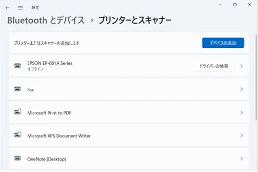 - スタートメニュー等から「設定」を開き,「Bluetoothとデバイス > プリンターとスキャナー」を開いてください.