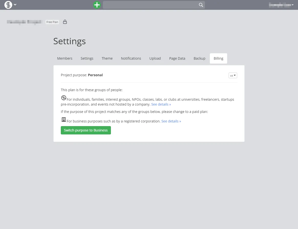- Billing: Allows you to change the purpose of the project, whether it is for free personal use or for paid business use.