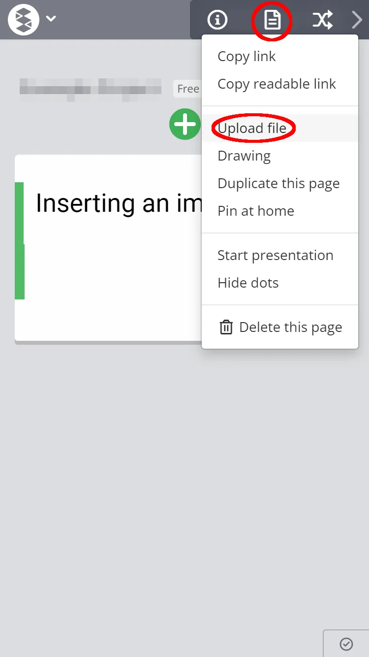 icon in the upper right corner, select “Upload file” (red circle in the image) to insert an image saved on your cell phone.