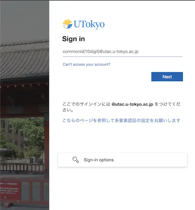 • Enter “10-digit Common ID + @utac.u-tokyo.ac.jp” in the input field and click “Next” (“次へ” in Japanese) button.