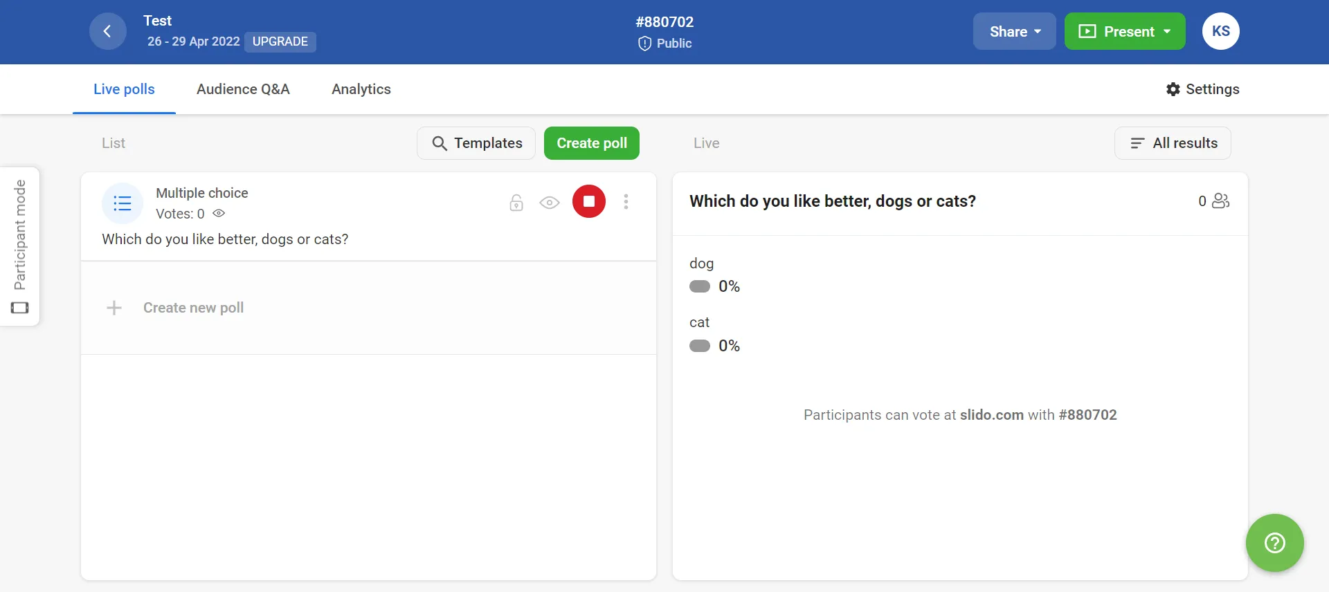 In Slido, the polls feature allows teachers to ask questions/quizzes to students. Select “Live polls” in the upper left corner of the screen.