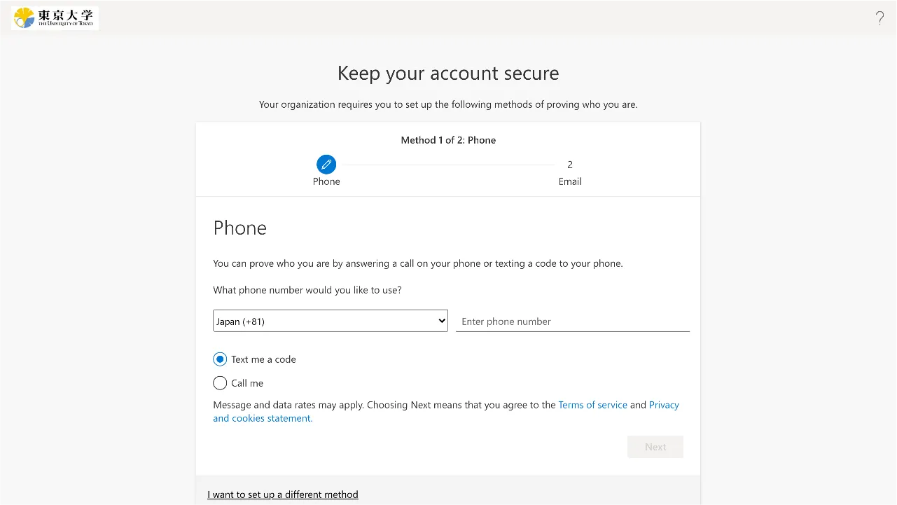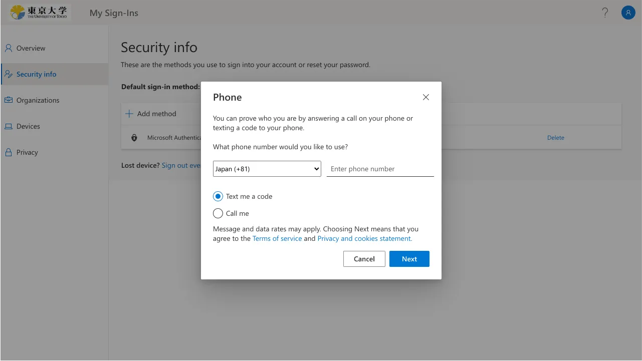Once the MFA is enabled, you will be asked to verify your identity with the SMS or authenticator apps you registered every time you sign in to your UTokyo Account. Be well aware that if you lose access to the registered verification method (smartphone apps, phone number, etc.), you will be unable to sign in to your UTokyo Account.