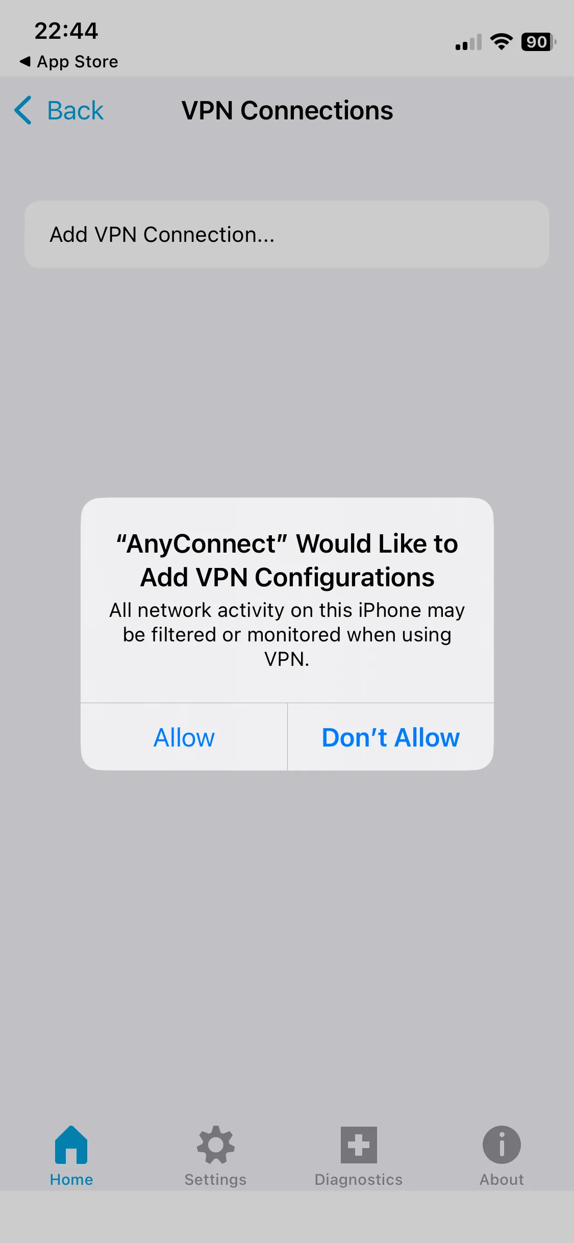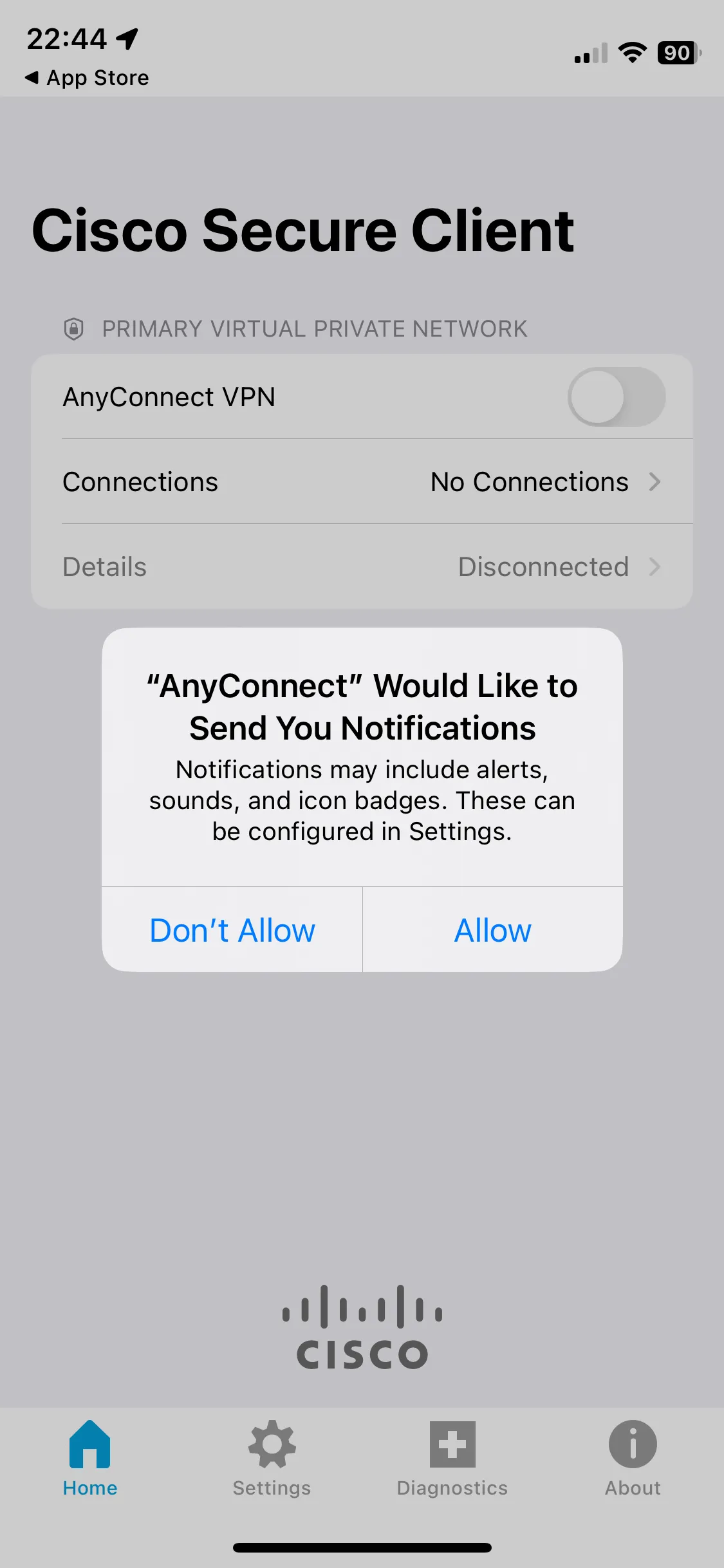 Step B: After installation, open the Secure Client app and check if the screen shown in the first image below is displayed. If the screen is displayed, then the installation is complete. When you open the application, you may be prompted to confirm the sending of notifications as shown in the second image below. You can choose either of the options.