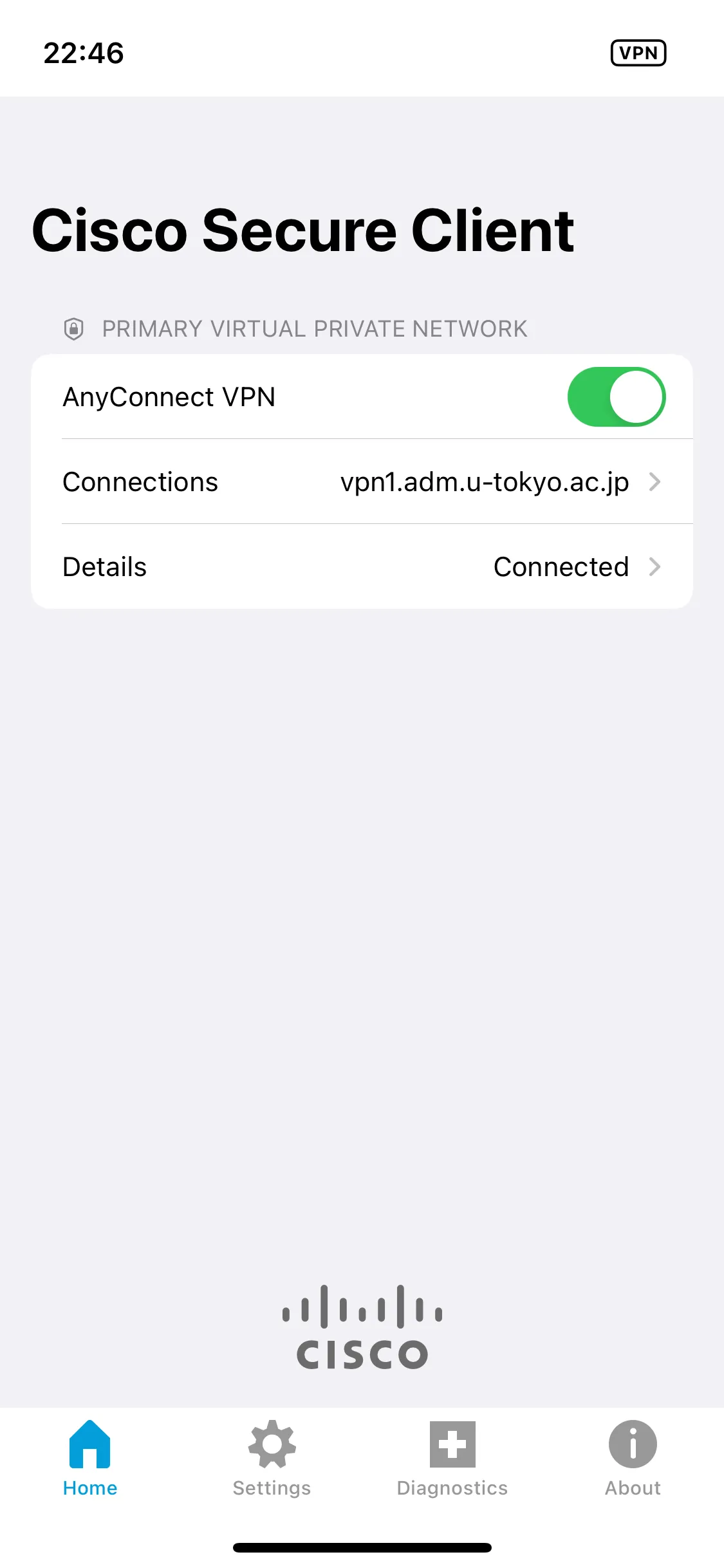Step G: Your device is connected to the UTokyo VPN if the “Details” screen shows “Connected” as shown below.