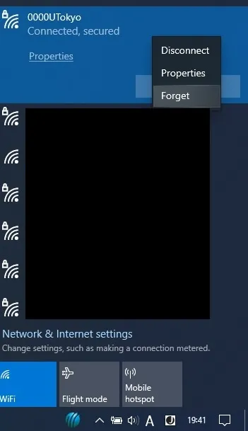 If you cannot find the SSID 0000UTokyo Depending on the location, the signal of the UTokyo Wi-Fi may not be reachable. Please change the location and try again. If you have never had any trouble using it at the location before but are experiencing issues now, please consult the Technical Support Desk