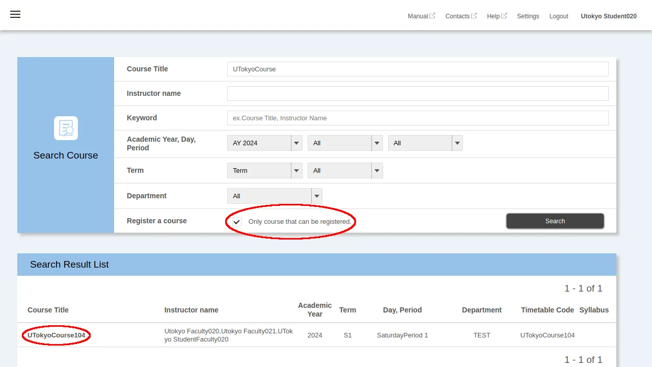To find the course you wish to enroll in, use the Search Course function. If you check the “Only courses that can be registered” box, only courses that allow “self-registration” will be displayed.