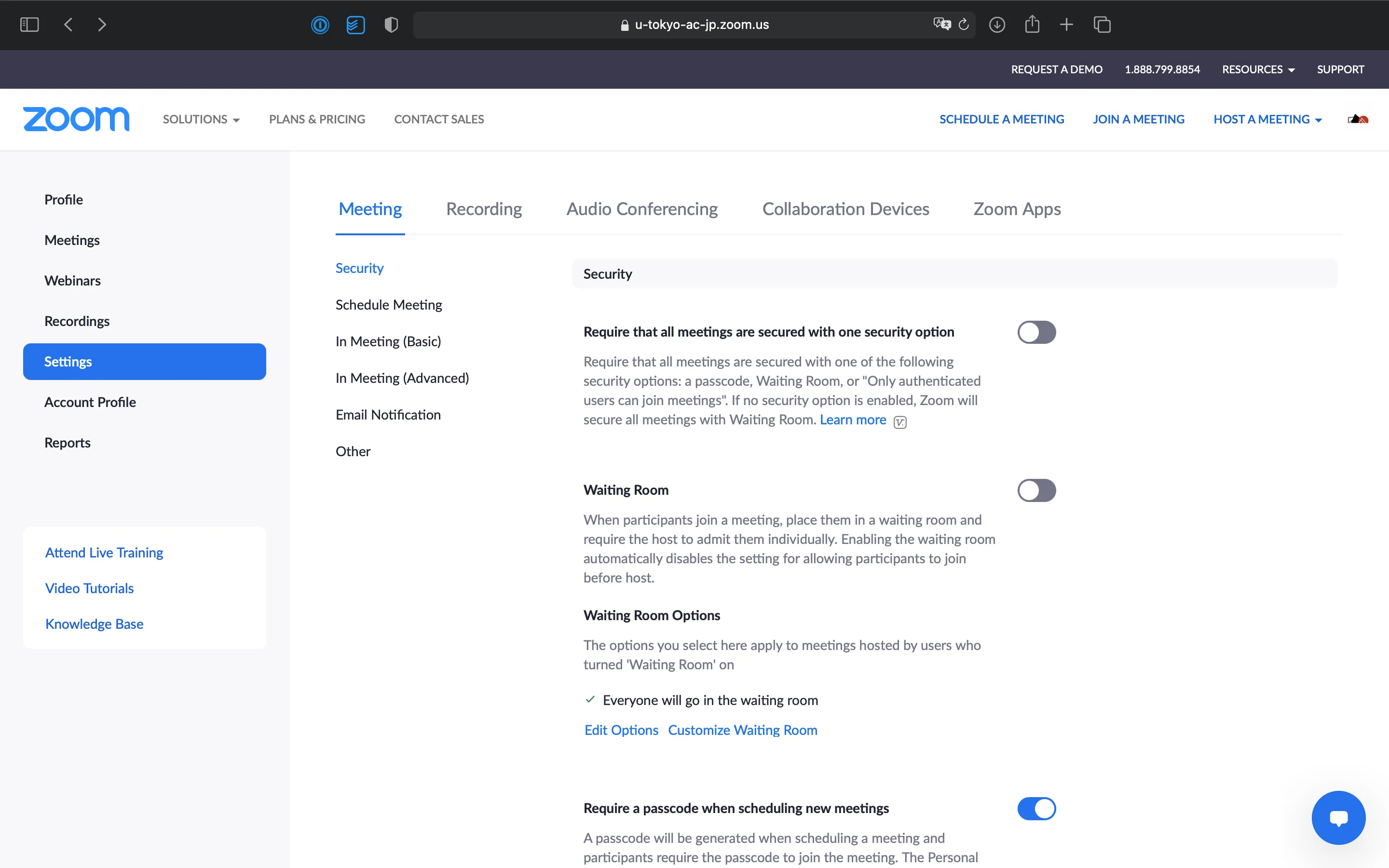 - Allow participants with UTokyo Zoom Account domains to bypass the Waiting Room. Such settings are shared among all meetings. Please double check if the settings are in place before starting a meeting.