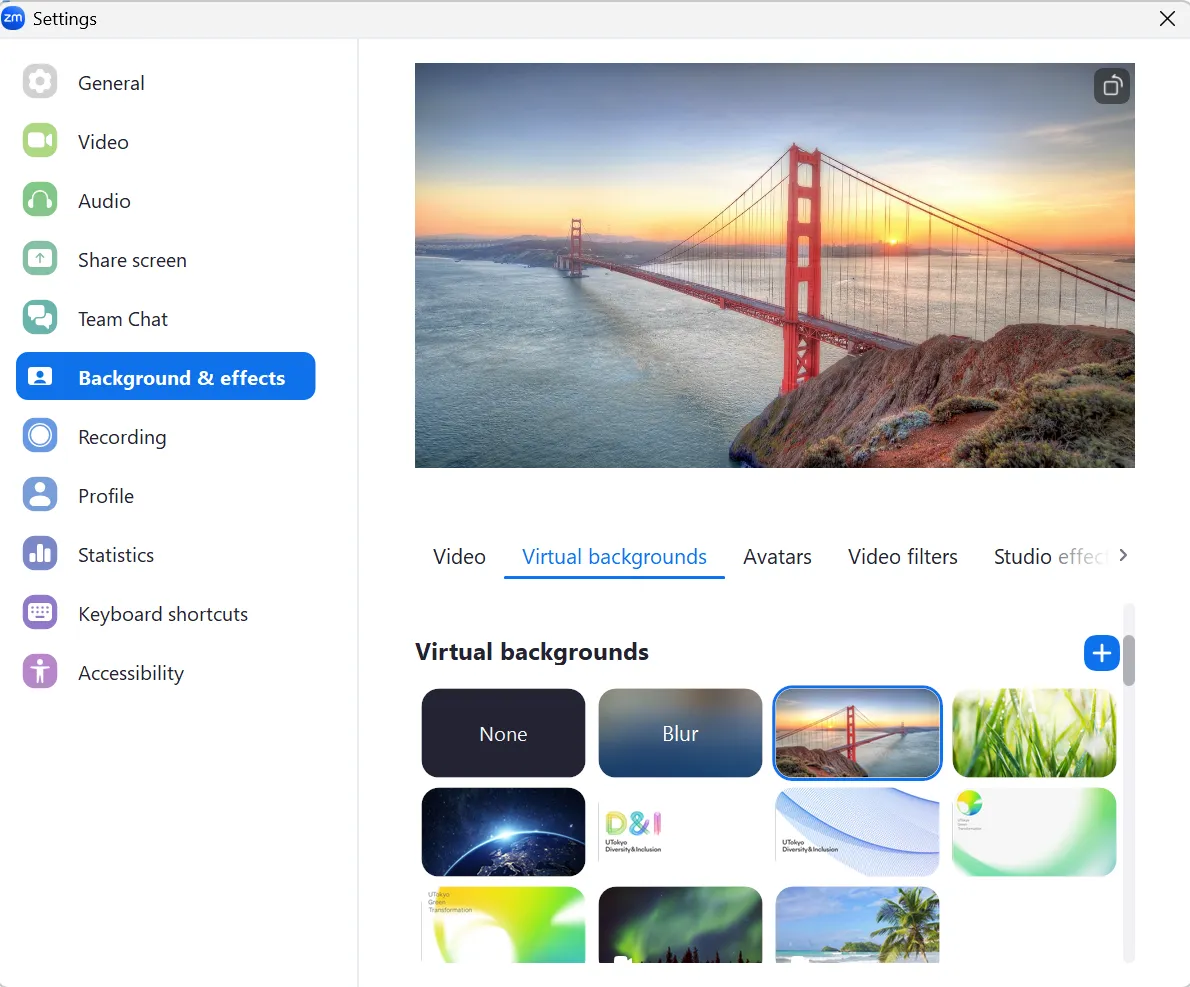 The virtual background feature allows you to project an image or video of your choice as a background during a Zoom meeting. By setting up a virtual background, you can prevent privacy-related images, such as those of your own room, from being shown during a camera-on meeting, or create a suitable environment for a meeting. If you set up a virtual background before the meeting, the virtual background will automatically appear when you turn on the camera during the meeting. It can also be activated during the meeting, even if it is not set before the meeting.