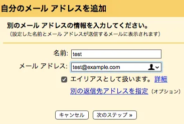 • 初期状態では「エイリアスとして扱います。」にチェックが入っており,登録するメールアドレスがECCSクラウドメールのメールアドレスと同等として扱われます(例えば,登録するメールアドレスに送られたメールが,ECCSクラウドメールのGmailの受信トレイにも表示されます).ただし,他のアカウントの代理でメールを送信する場合など,「エイリアスとして扱います。」のチェックを外すことが推奨される場合があります.設定の詳細については,Googleのヘルプ「Gmail の「エイリアスとして扱います」の使用方法」を参照してください.