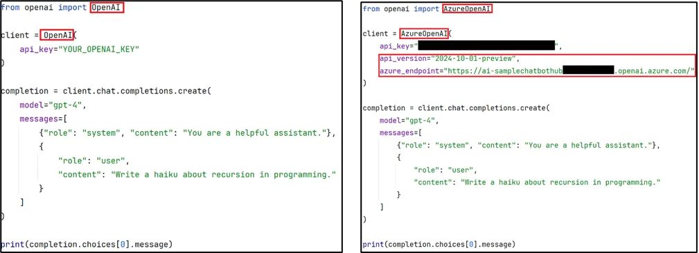 Python でコーディングします.以下はコーディングの一例で,左が OpenAI クラスを利用した場合,右が Azure 互換の OpenAI を利用した場合です.
