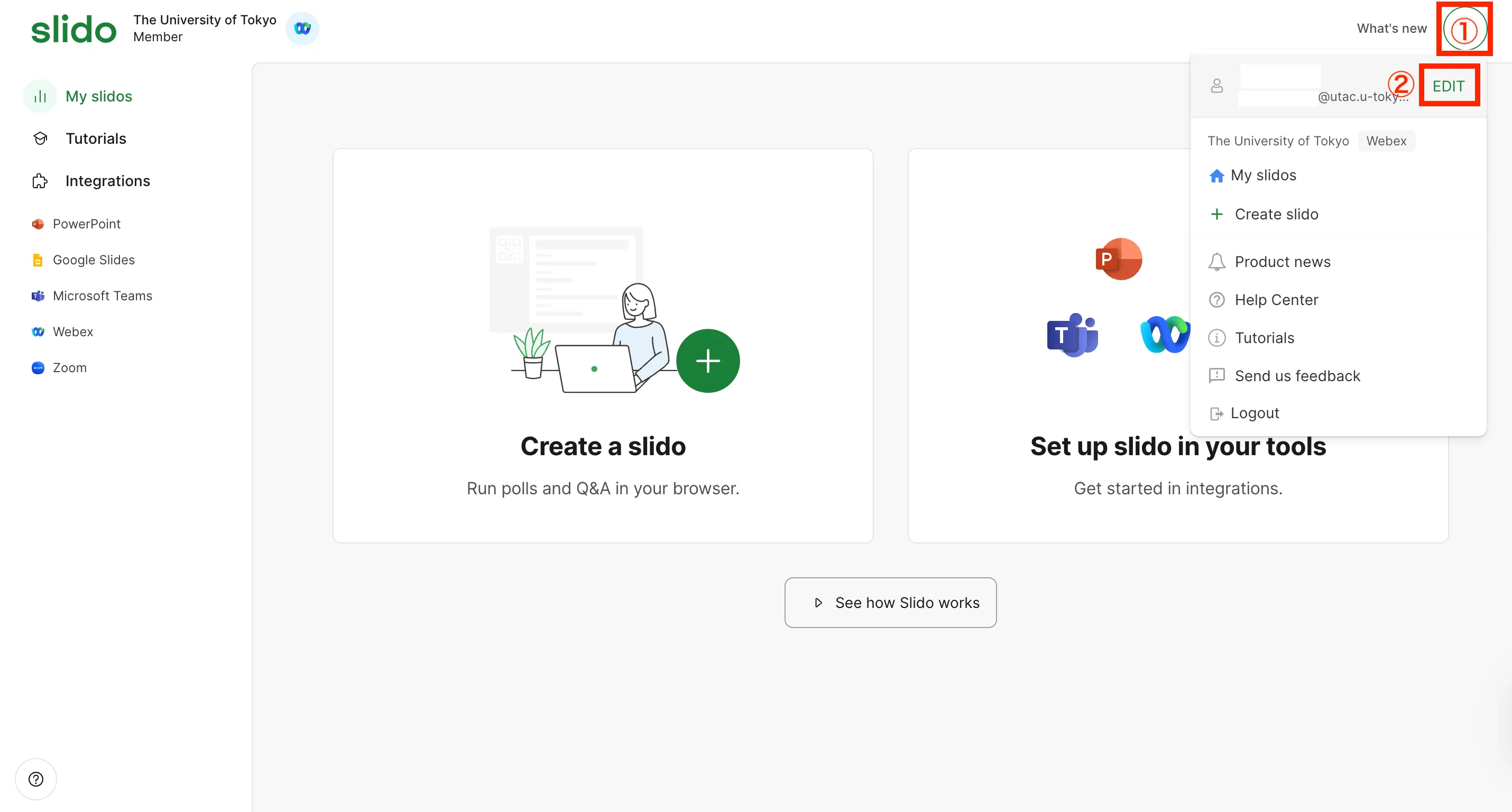 サインイン直後の画面が英語で表示されている場合は,以下の手順で日本語に変更することができます.- ①画面右上のプロフィールアイコンをクリックし,②「EDIT」ボタンをクリックしてください.