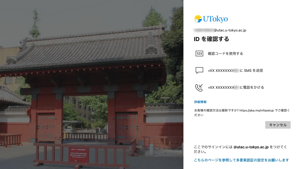 UTokyo Accountでは多要素認証 (Multi-Factor Authentication, MFA) を導入しています.多要素認証を設定すると,アカウントにサインインする際に,パスワードに加えて,SMSや専用のアプリ等での本人確認が要求されるようになります.詳細はUTokyo Accountにおける多要素認証の利用についてを参照してください.