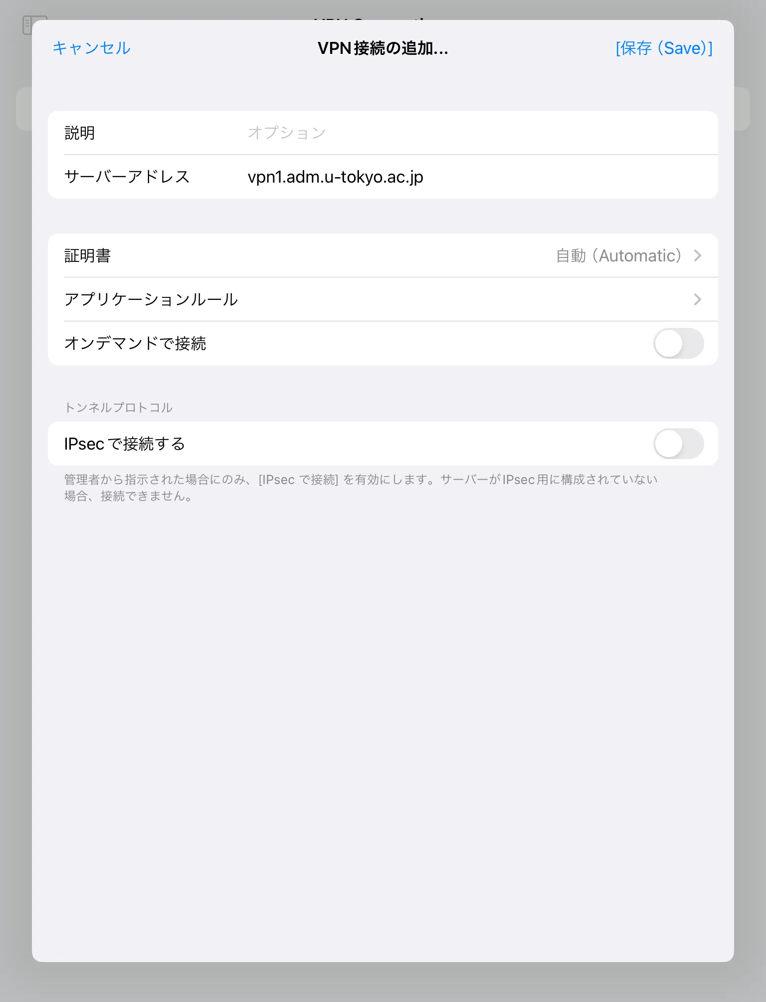 手順D: 左側のサイドバー内にある「接続」をタップし,続いて表示される画面で「VPN接続の追加」をタップすると,以下のような画面が表示されます.「サーバアドレス」の横の入力欄をタップして vpn1.adm.u-tokyo.ac.jp と入力します.