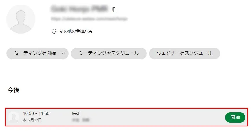 設定した日時が近すぎる(10分以内)と,「スケジュールする」ボタンではなく「開始」ボタンになり,すぐに会議が開始できます.